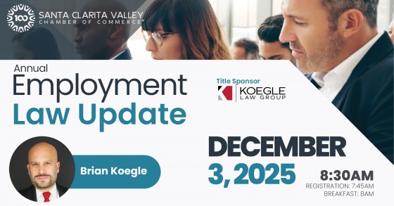 The Santa Clarita Valley Chamber of Commerce will host its annual Employment Law Update on December 3, 2026, featuring Brian Koegle of Koegle Law Group, who will provide key insights on upcoming regulatory changes for California employers. The 90-minute session at College of the Canyons University Center aims to equip businesses with crucial compliance knowledge and strategies to proactively address new challenges. Attendees can participate in discussions and gain practical tools for navigating the evolving legal landscape.