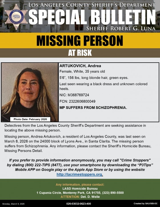 The Los Angeles County Sheriff’s Department is asking for the public’s assistance in locating 35-year-old Andrea Artukovich, who was last seen March 8, 2026, on Lyons Avenue in Santa Clarita. Authorities say Artukovich, who has schizophrenia and is considered at risk, was wearing a black dress and heels at the time of her disappearance. Anyone with information is urged to contact the LASD Missing Persons Unit or submit tips anonymously through Crime Stoppers.