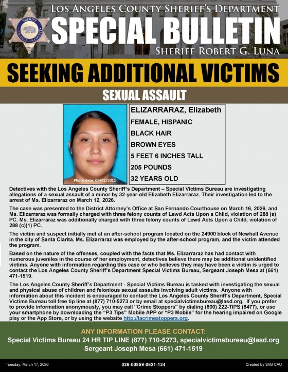 The Los Angeles County Sheriff’s Department has arrested 32-year-old Elizabeth Elizarraraz in connection with the alleged sexual assault of a minor she met while working at an after-school program in Santa Clarita. Prosecutors have filed six felony charges related to lewd acts involving a child, and investigators believe there may be additional victims due to her contact with numerous juveniles. Authorities are urging anyone with information to come forward.
