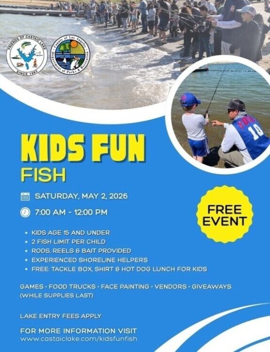 The Friends of Castaic Lake and the Los Angeles County Department of Parks and Recreation will host the annual “Kids Fun Fish” event on Saturday, May 2, from 7 a.m. to noon at Castaic Lake. The free event for children 15 and under will feature fishing, games, face painting, food trucks and giveaways, with rods, bait and a two-fish limit provided; lake entry fees still apply. Registration and volunteer information is available on the Castaic Lake website.