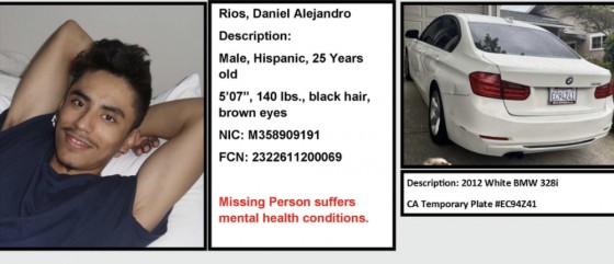 The Los Angeles County Sheriffās Department is asking for the publicās help in finding 25-year-old Daniel Alejandro Rios of Santa Clarita, who was last seen Wednesday morning around 11:15 a.m. in Sylmar. Rios is described as 5 feet 7 inches tall, 140 pounds, and is believed to be driving a white 2012 BMW 328i with a temporary license plate EC94Z41. Anyone with information is urged to contact the Sheriffās Department Missing Persons Detail or Crime Stoppers anonymously.