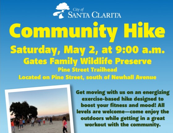 The city of Santa Clarita will host a community hike on Saturday, May 2, at 9 a.m. at the Gates Family Wildlife Preserve, starting from the Pine Street Trailhead. The 1.7-mile moderate hike, featuring a 200-foot elevation gain, is open to all fitness levels and welcomes leashed dogs. More information is available through the city’s Outdoor Recreation department and its @HikeSCV social media page.