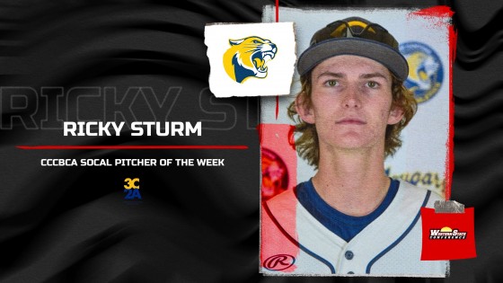 College of the Canyons pitcher Ricky Sturm has been named the California Community College Baseball Coaches Association SoCal Pitcher of the Week after earning both a save and a complete-game victory against L.A. Mission College. Sturm allowed just one run on five hits in his dominant outing and now holds a 5-2 record over 56.1 innings this season. He shares weekly honors recognition with standout players from Palomar, Cuesta, Santa Barbara, and Antelope Valley.